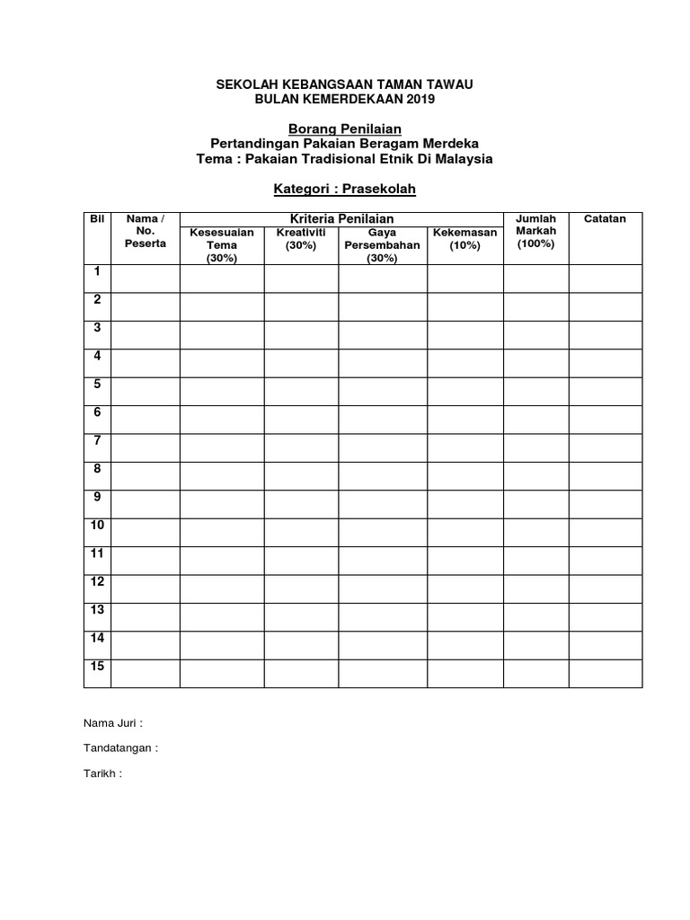 Borang Hakim Merdeka from imgv2-2-f.scribdassets.com Text of borang markah pertandingan pakaian beragam.docx. Sekolah menengah kebangsaan puncak alam 3 jalan astana alam 13 2 42300 bandar puncak alam. Sambutan bulan kemerdekaan 2013sekolah kebangsaan padang tengku. Borang markah chef rimba 1. 100%(1)100% found this document useful (1 vote). Bahkan belakangan mulai marak toko pakaian khusus ukuran xxxl. Sekolah kebangsaan (p) methodist 2. 2019 10 18 pertandingan pakaian beragam tema 60an sempena hari kanak kanak.
