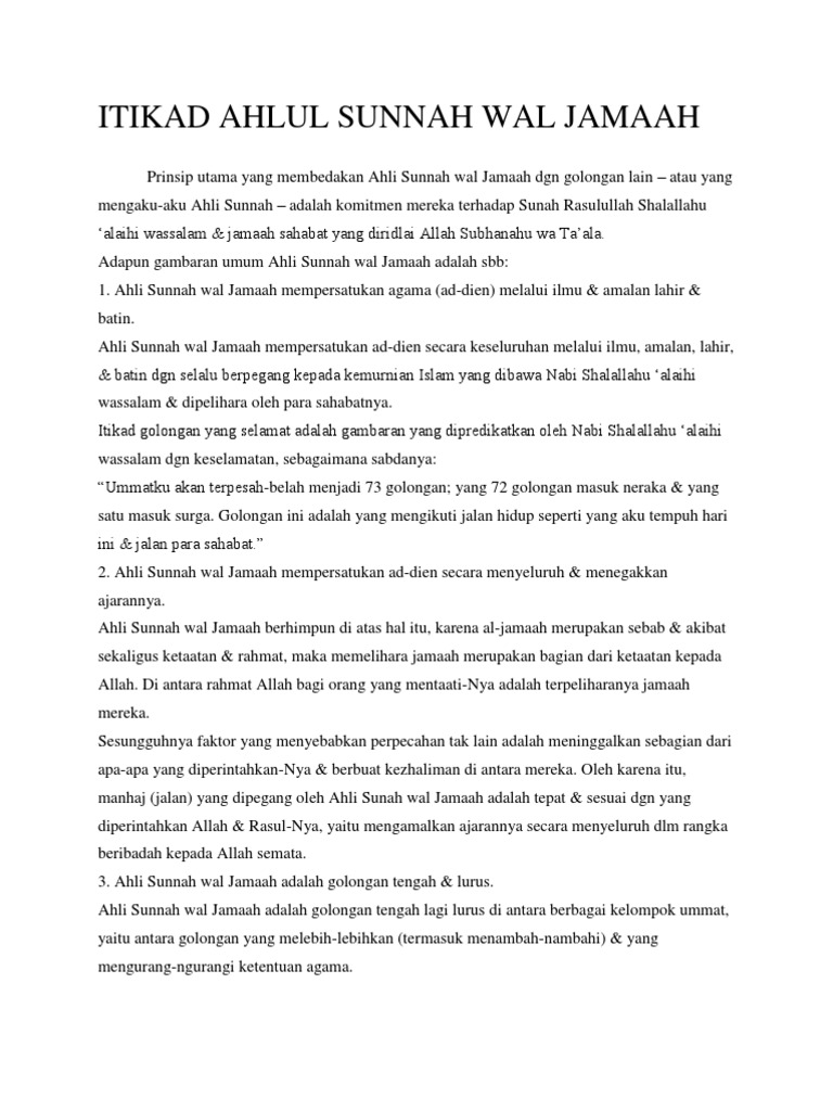 Aqidah ahli sunnah wal jamaah adalah satu pegangan yang berakar umbi dari ajaran yang dibawa oleh rasulullah s.a.w. Tiga masalah pokok allah swt adalah yang mencipta kita dan mencipta semua perbuatan kita. Selain ahli sunnah, beiau juga menggunakan istilah lain, yaitu ahlul haq wassunnah. Cara untuk memelihara pegangan terhadap ahli sunnah wal jamaah. Kesatuan ummah di atas landasan ahli sunnah wal jamaah (aswj) di negara ini perlu dipelihara supaya umat islam tidak tergelincir daripada pegangan akidah yang benar. Mereka menerima dan beramal dengan sunnah rasulullah s.a.w. Arti kata ahlu ( yang bermakna keluarga, pengikut, dan penduduk); Menghindari orang yang terlibat dengan ajaran yang lain. Allah memberi kuasa memilih kepada manusia berdasarkan akal dan wahyu dalam melakukan perkara atau perbuatan. Akidah ahli sunnah wal jamaah: فصل في إبانة قول أهل الحق والسنة. Materi ini dibahas di masjid utama pesantren tambakberas jombang yang dipimpin oleh kh afifuddin muhajir. Aswaja merupakan singkatan dari ahlus sunnah wal jamaah, terdiri dari tiga kata, yaitu :