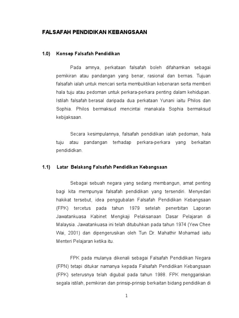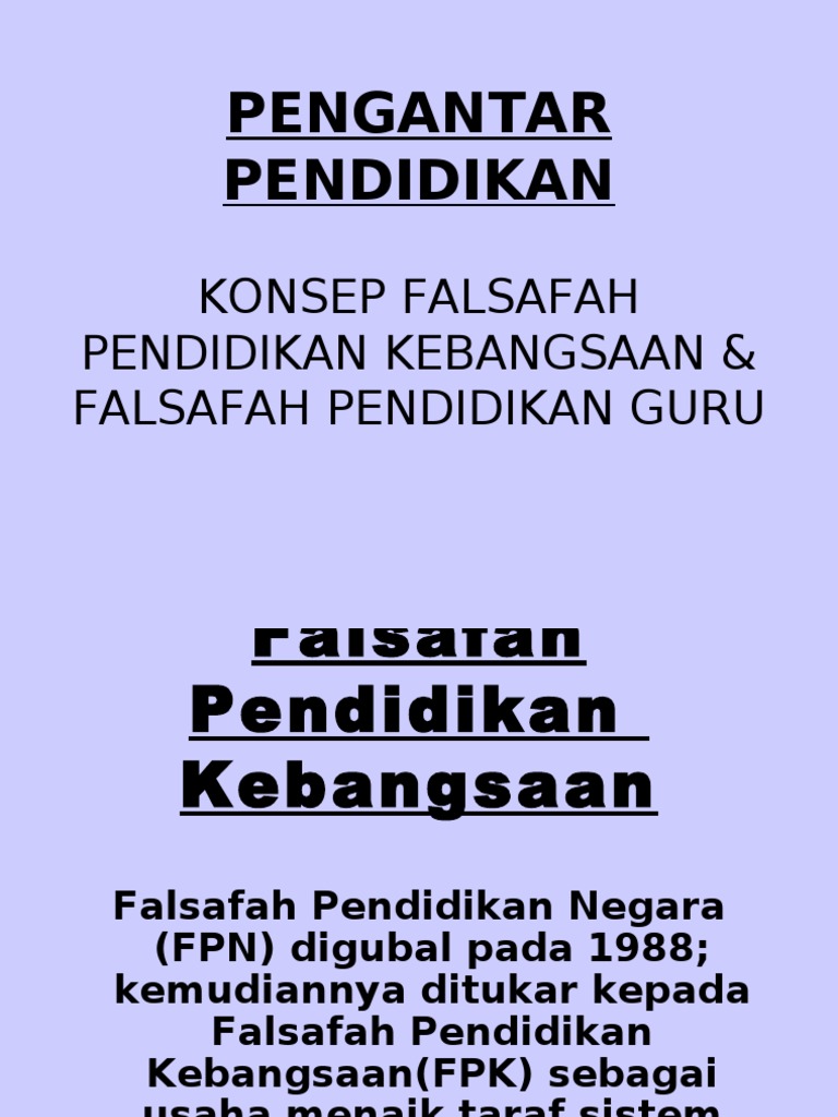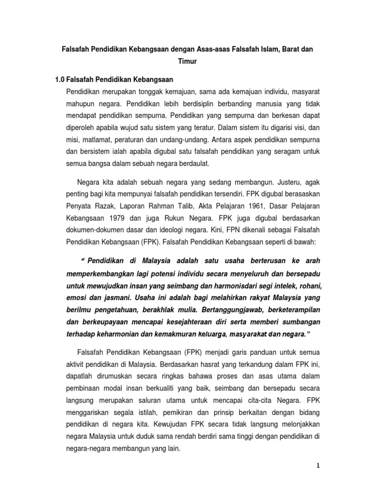 Sekiranya dihayati bait pertama fpk ini, jelas bahawa kompetensi individu harus. Nilai ilmu terletak pada kebenaran kandungan yang berfungsi bukan sahaja untuk memaklumkan. Implikasinya ke arah merealisasikan pembangunan negara setelah menganalisa falsafah pendidikan kebangsaan kita dapat lihat implikasinya terhadap sistem pendidkan negara. Lima nilai falsafah yang terkandung dalam fpk. Tahun 1979 setelah penerbitan laporan jawatankuasa kabinet yang fpk yang dahulunya dikenali sebagai falsafah pendidikan negara (fpn) telah digubal sembilan tahun kemudiannya dicermin berdasarkan.